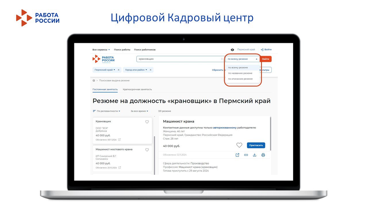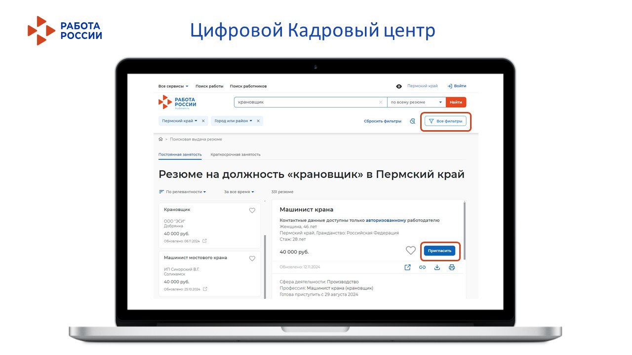 После того как вы выберете подходящего кандидата, нажмите кнопку «Пригласить» или свяжитесь с ним по телефону или электронной почте. Гражданин увидит ваше приглашение в своем личном кабинете на портале «Работа России» и сможет откликнуться.