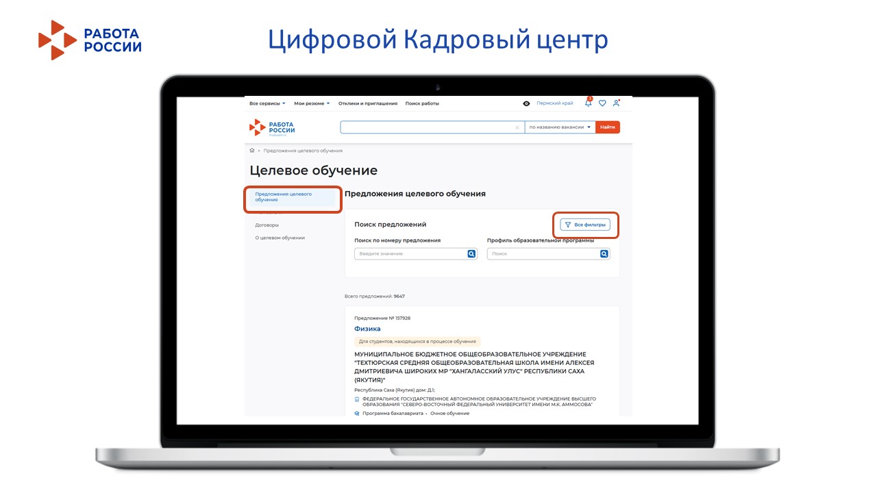 • На портале «Работа России» любой абитуриент может выбрать более чем из 9 000 предложений о целевом обучении.