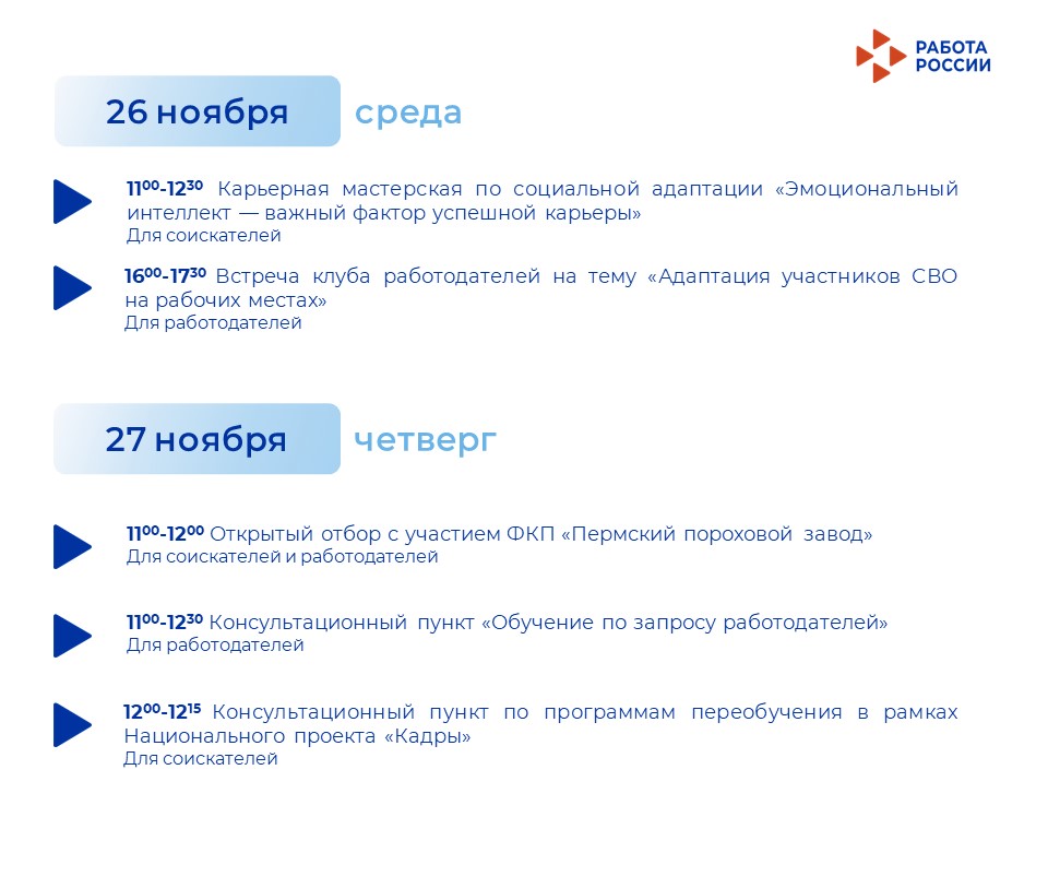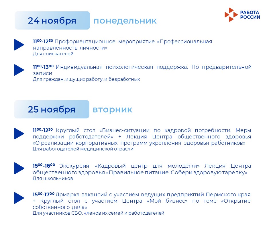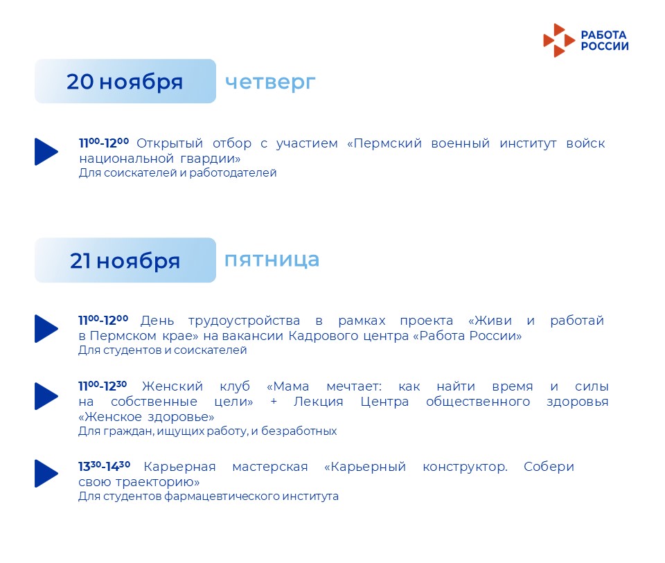 Приглашаем жителей Перми и Пермского края на мероприятия флагманского Кадрового центра «Работа России» на ул. Монастырская 2б