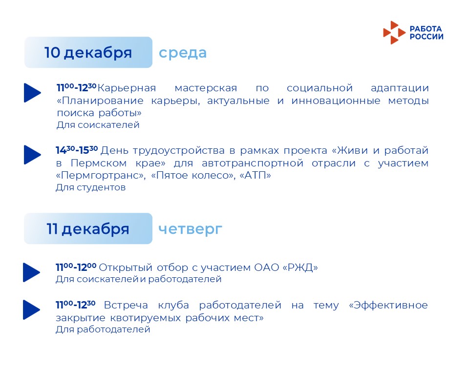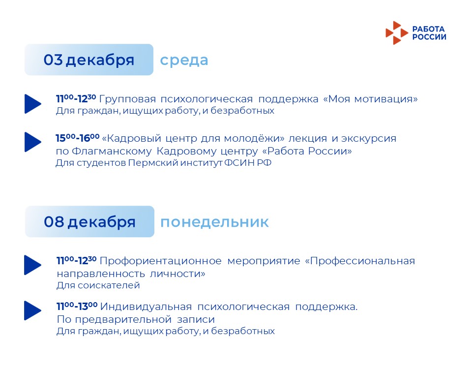 Приглашаем жителей Перми и Пермского края на мероприятия флагманского Кадрового центра «Работа России» на ул. Монастырская 2б