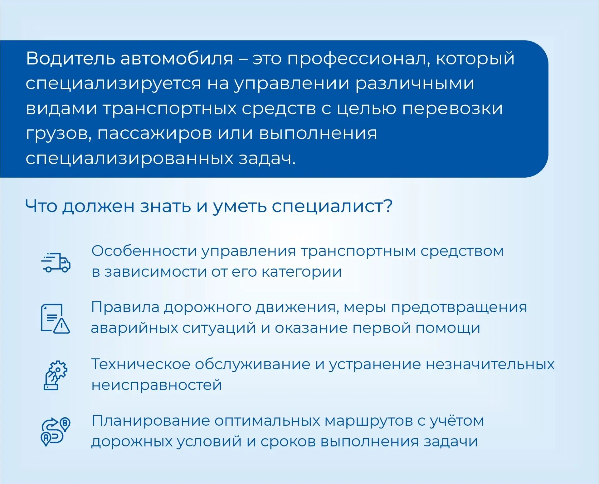 С полным перечнем требований к профессии можно ознакомиться в профессиональных стандартах «Водитель внедорожных автомототранспортных средств» код 17.016 или «Водитель автомобиля, занятый в технологическом процессе добычи и обогащения полезных ископаемых» код 17.126.