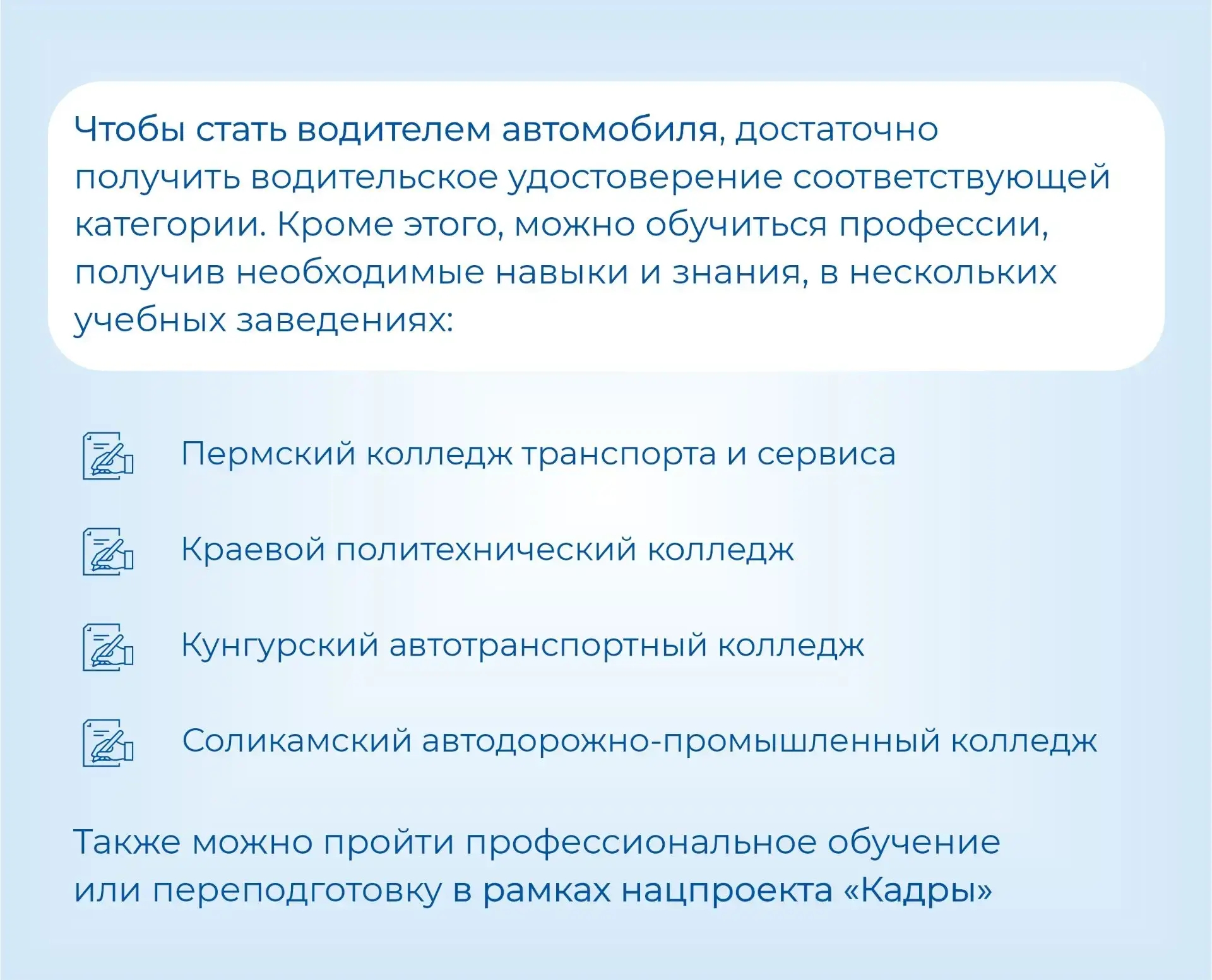 Чтобы стать водителем автомобиля, необходимо получить водительское удостоверение соответствующей категории. Также профессию можно освоить в специализированных учебных заведениях, например, в Пермском колледже транспорта и сервиса или Кунгурском автотранспортном колледже. Кроме того, профессию можно освоить в рамках бесплатного переобучения по нацпроекту «Кадры». Всего для обучения доступно 213 востребованных специальностей.